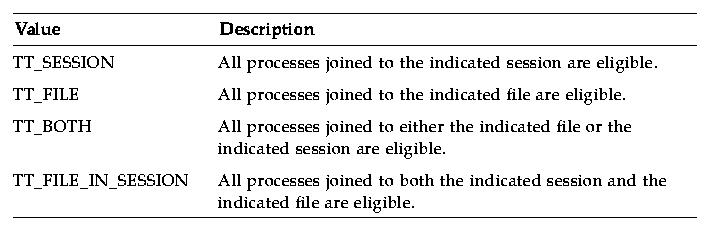 Tt_scope values for the Scope attribute of a message or pattern indicate the set of processes eligible to receive the message. Table 2-8 describes the possible values.