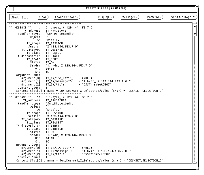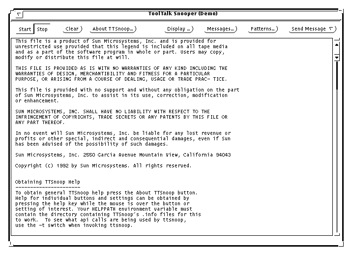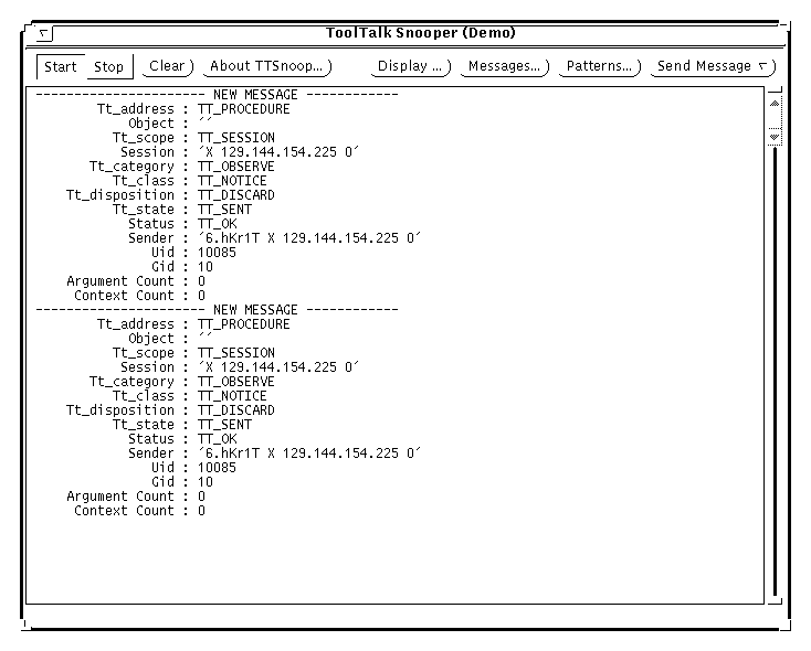 The -t option displays the ToolTalk API calls that are being used to construct a particular pattern or message. Figure 5-1 shows the window that is displayed when ttsnoop starts.