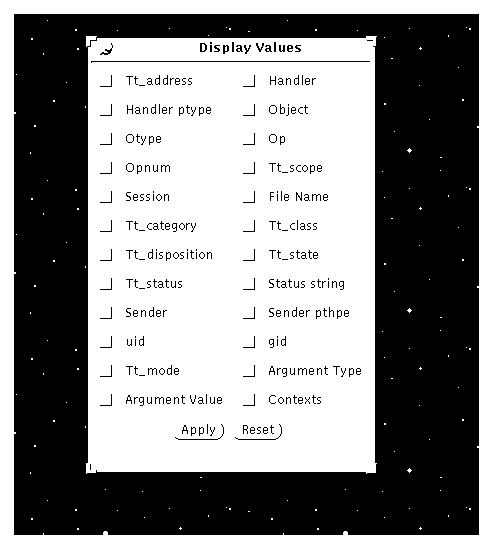 - Press this button to popup a panel of checkboxes to highlight specific ToolTalk message components on the ttsnoop display subwindow.