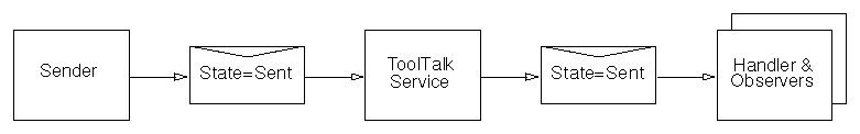 The sending process creates a message, fills in attribute values, and sends it. The ToolTalk service matches message and pattern attribute values, then gives a copy of the message to one handler and to all matching observers. File-scoped messages are automatically transferred across session boundaries to processes that have declared interest in the file.