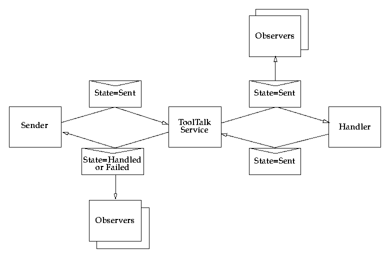 The ToolTalk service delivers a request to only one handler. The handler adds results to the message and sends it back. Other processes can observe a request before or after it is handled, or at both times; observers absorb a request without sending it back.