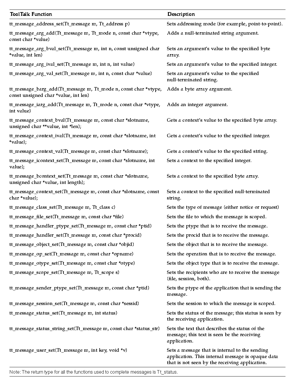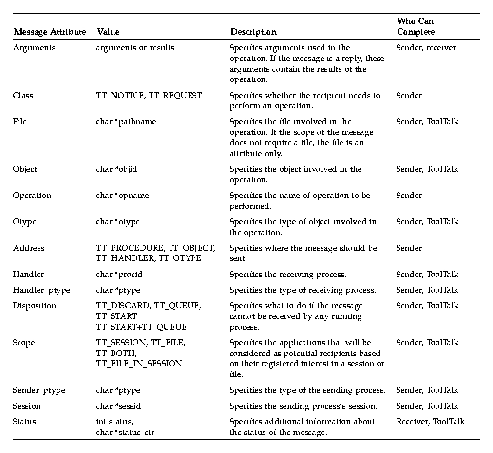 ToolTalk messages are simple structures that contain attributes for address, subject (such as operation and arguments), and delivery information (such as class and scope.) Each message contains attributes fromTable 8-1.