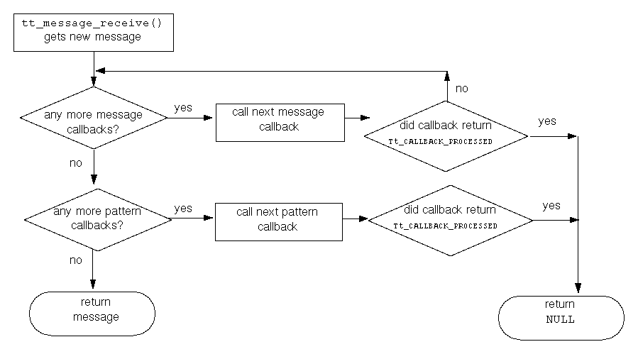 Figure 11-4 illustrates how the ToolTalk service invokes message and pattern callbacks when tt_message_receive is called to retrieve a new message.