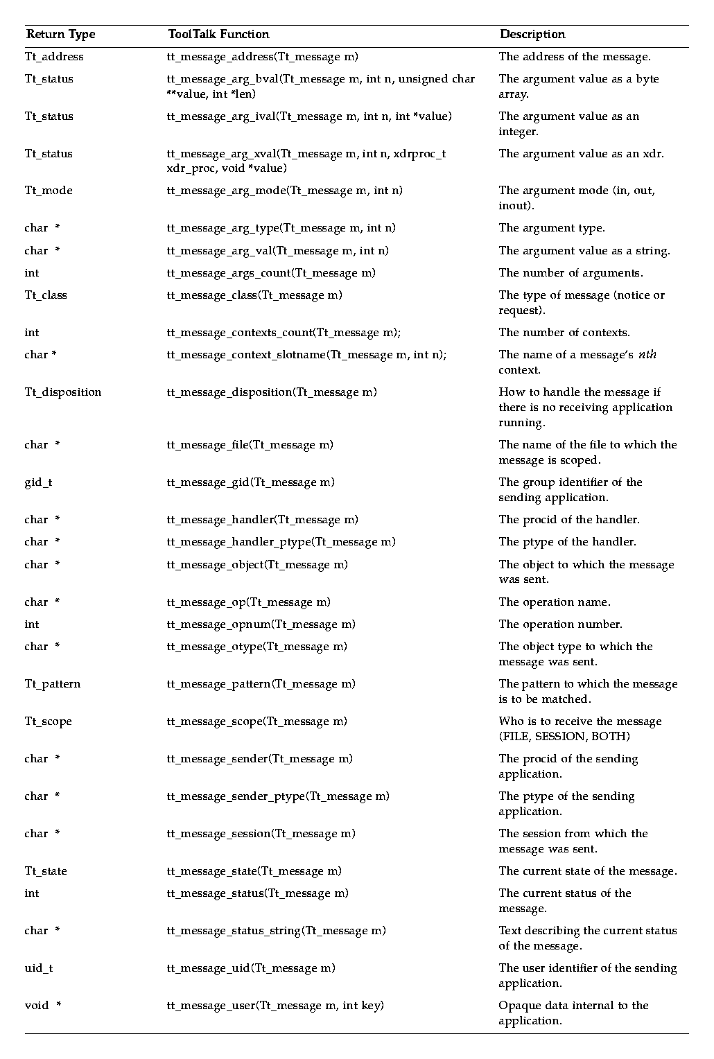 Table 11-1 lists the ToolTalk functions you use to examine the attributes of a message you have received.