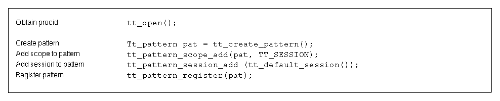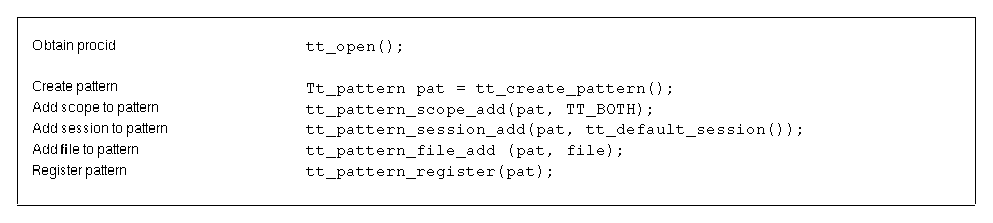 The type TT_FILE_IN_SESSION scopes to the specified file in the specified session only. A pattern with this scope set will only match messages that are scoped to both the file and the session. Code Example 3-5 adds the session and then registers the pattern.
